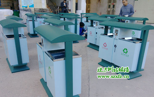 深圳龍崗區(qū)街道辦采購F95戶外鋼板分類垃圾桶,按照15天交貨日期,如期完工,送貨上門。此款F95戶外鋼板分類垃圾桶規(guī)格為:1000*400*1000.鋼制垃圾桶屋檐桶頭設(shè)計(jì),防止雨水傾入內(nèi)桶。煙頭投口,分類垃圾,隔絕火患。有害投口,充分利用空間。桶兩邊都絲印有,標(biāo)志,字體,不可回收字樣,采用紅顏色。 標(biāo)志,字體,可回收字樣,采用綠顏色。巧妙的設(shè)計(jì),結(jié)合城市人性化,更好服務(wù)城市居民。