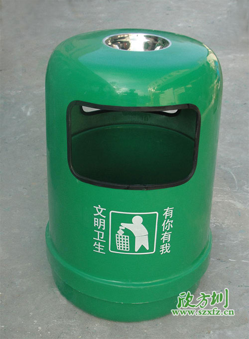 此款欣方圳玻璃鋼果皮箱垃圾桶采用優質玻璃纖維與進口樹脂著色合成,采用模具一次成 型。玻璃鋼造型精美、潔凈、美觀、醒目、不退色,它具有強度高、耐腐蝕、耐酸堿、抗老化、太陽暴曬下 不變形、抗紫外線、操作方便等特點是其他材質無法取代的。玻璃鋼果皮箱桶身倆側大開口設計,方便雜物投入。開口處有強化塑膠貼合開口避免投放時造成劃傷,頂端外置不銹鋼大口徑煙灰缸,方便市民的隨手熄滅煙頭。