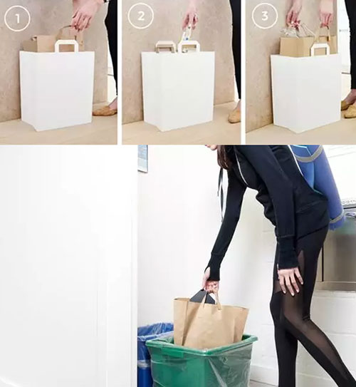 它的正確使用方式是搭配上購物紙袋,這一點和我們的習慣似乎不太一樣,也許是因為美國購物時使用紙袋更多,勤儉持家的家庭主婦們將這些紙袋用作垃圾袋,可是紙袋不夠牢固,放上東西便會東倒西歪,有這樣一個垃圾桶正好解決問題,其實它的外形也和購物紙袋有些相似呢。當然,將紙袋換成我們習慣的塑料袋,照樣可以優(yōu)雅地裝垃圾。它有黑白兩色可選,放在辦公室、廚房均可。