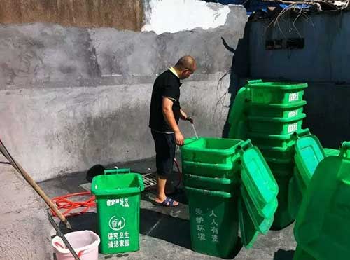 前天上午8點(diǎn),金棉小區(qū)廢棄籃球場(chǎng)的東南角就響起了一陣陣沖洗聲,清潔人員劉師傅拿著水管沖洗著一只只垃圾桶,邊上一排晾著幾十只剛洗干凈的垃圾桶。這些垃圾桶都是早上從小區(qū)里收集來的,洗干凈晾干后,第二天去替換其他臟的垃圾桶。