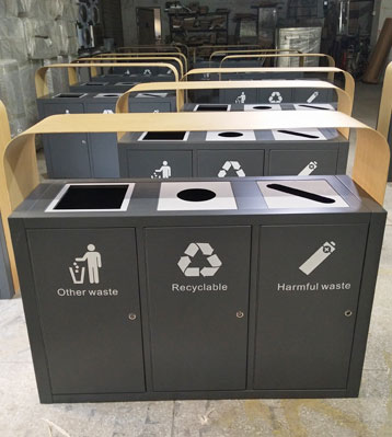 欣方圳三分類仿木紋鋼制烤漆垃圾桶批量生產圖