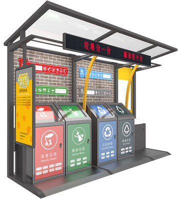 設(shè)有擋雨棚,可配備垃圾箱信息顯示屏、防水照明燈、廣告屏,進(jìn)行地面硬化。對(duì)社區(qū)玻金塑紙可回收物,其他垃圾,廚余垃圾,有害垃圾等生活垃圾定時(shí)定點(diǎn)投放收集.